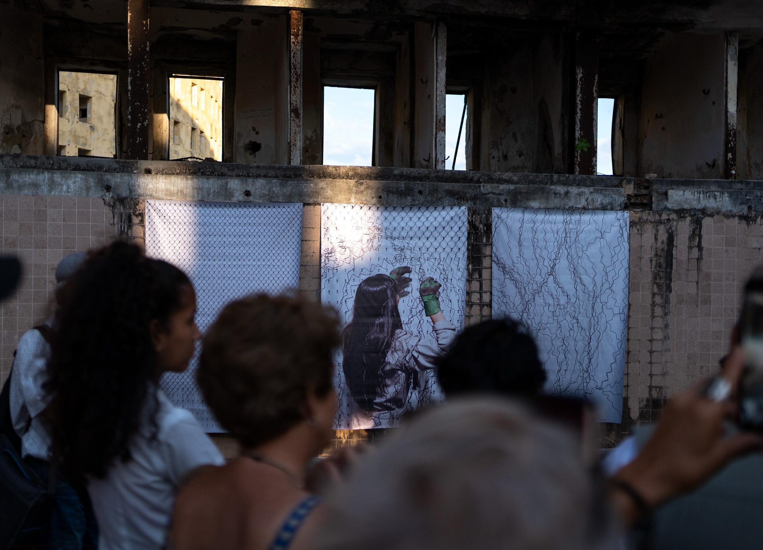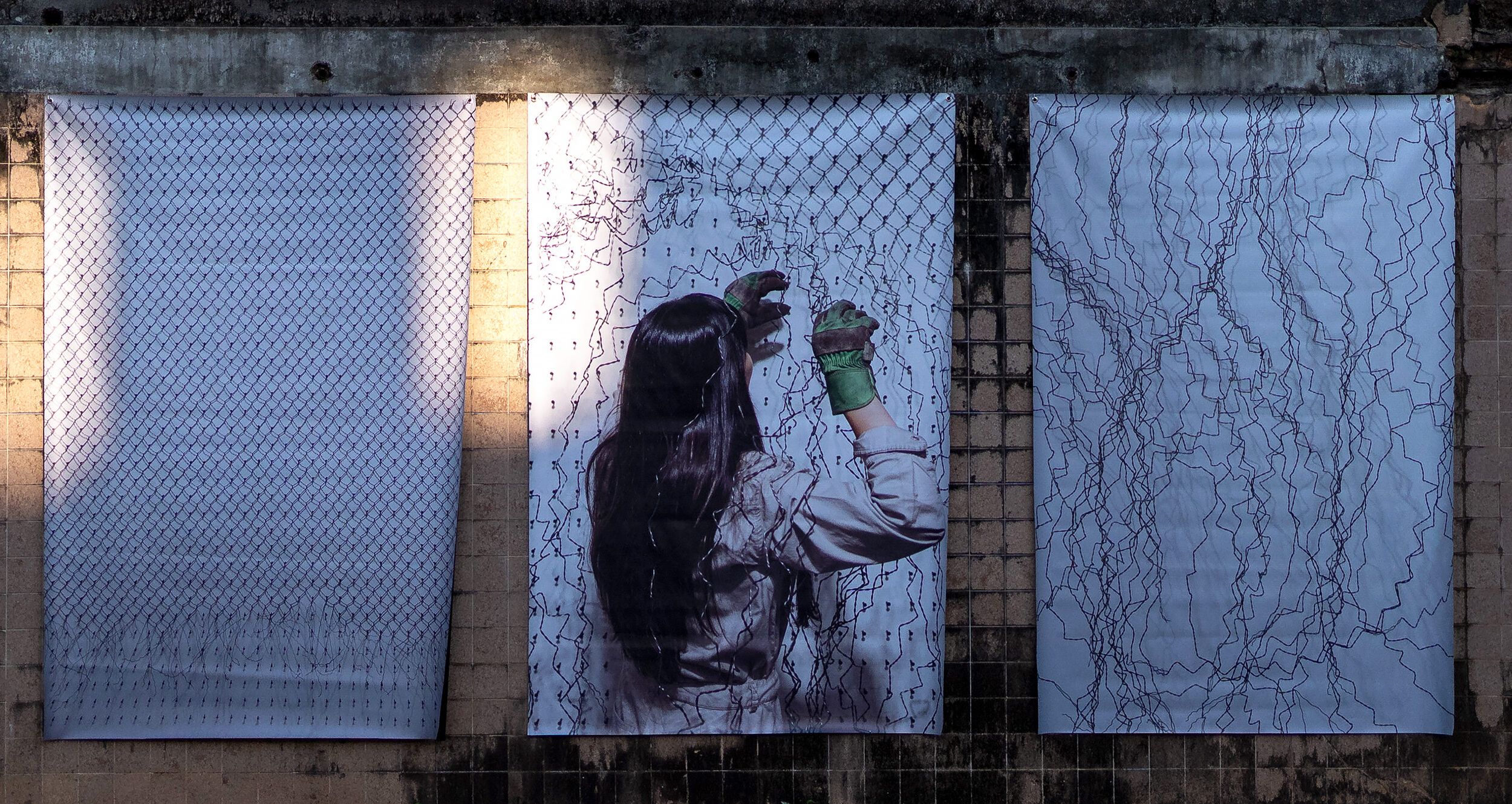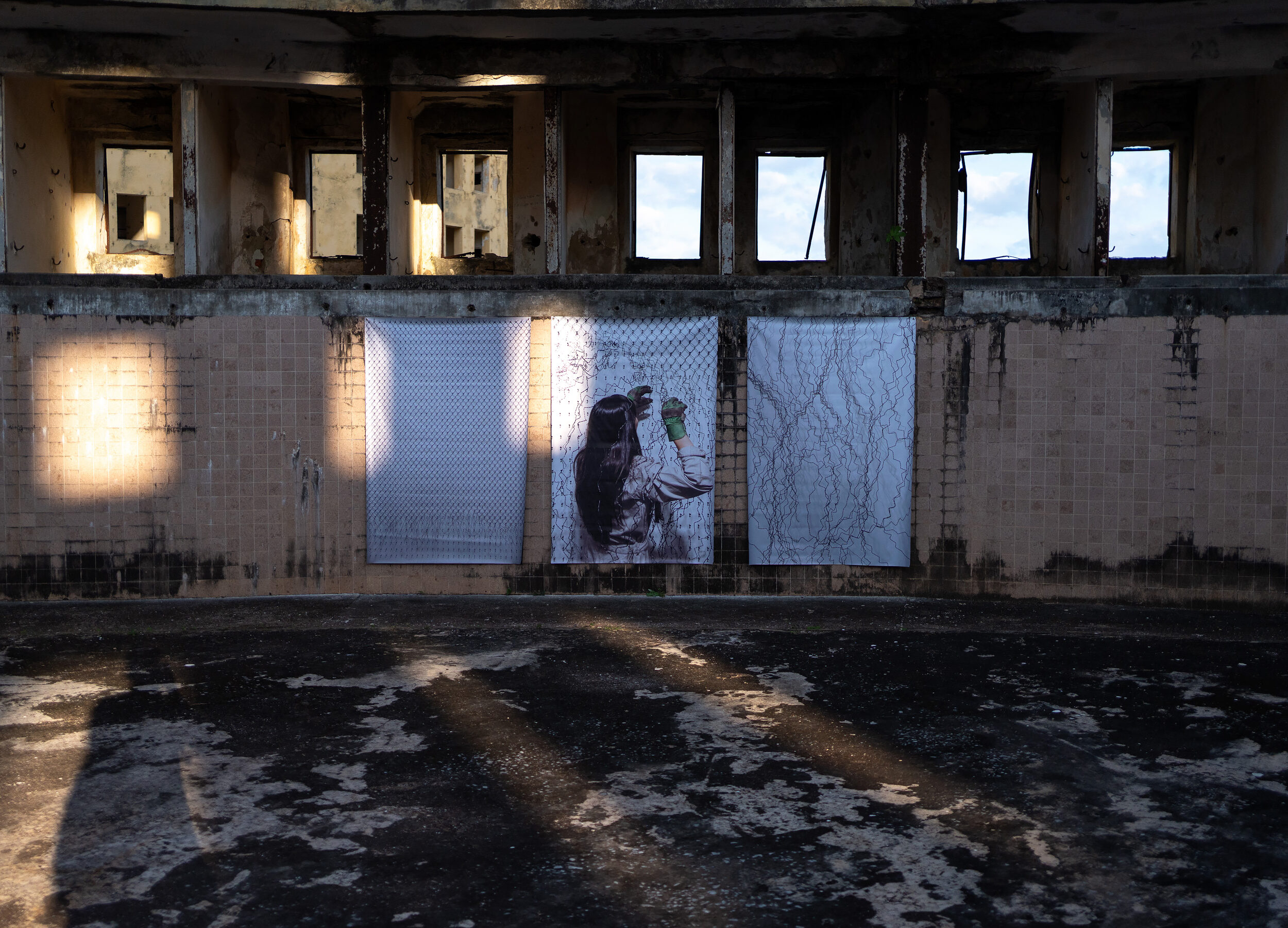 This piece, a new iteration of ‘Meditations on Fear’, consists of three large-scale prints born out of the manual weaving and unweaving of an 8 x 8-foot steel wire fence. Installed inside the haunting halls of Presidio Modelo on Isla de la Juventud, the work inhabits a heavy, silent space, engaging with issues of memory, censorship, self-censorship, and disobedience.