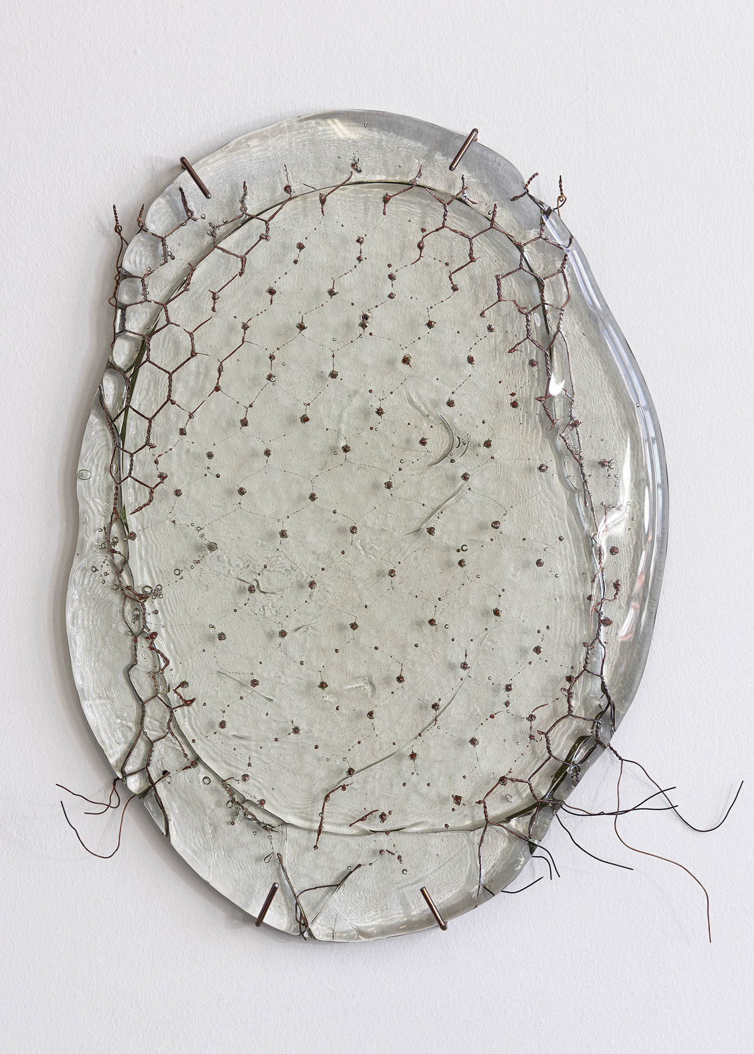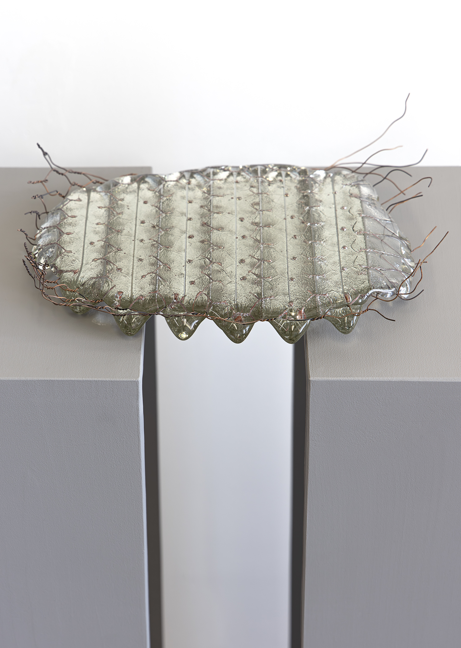 The glass preserves the memory of the wire even as it is transformed—burned, melted, or distorted—creating a sense of fossilization and lingering presence. These works evoke the traces of process embedded in material change. Through light, transparency, and texture, the pieces suggest subtle forms of political and social defiance, showing traces of heat that carry strength and challenge boundaries.