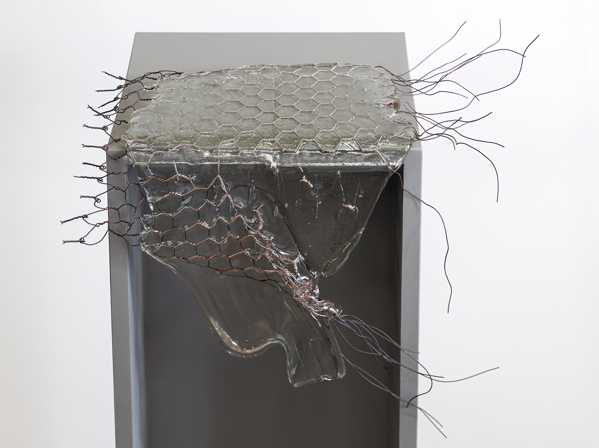 I hand-weave chicken wire nets and encase them in molten glass to explore dynamics of power and control. The subtle reference to industrial chicken farming acts as a parallel, revealing how established boundaries—real or perceived—shape human relationships.
